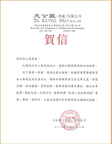 香港青島總會賀信 健康衛(wèi)視賀信