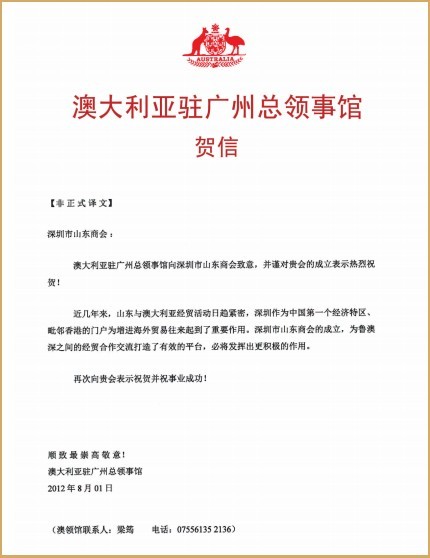 澳大利亞駐廣州總領(lǐng)事館賀信 大公報賀信