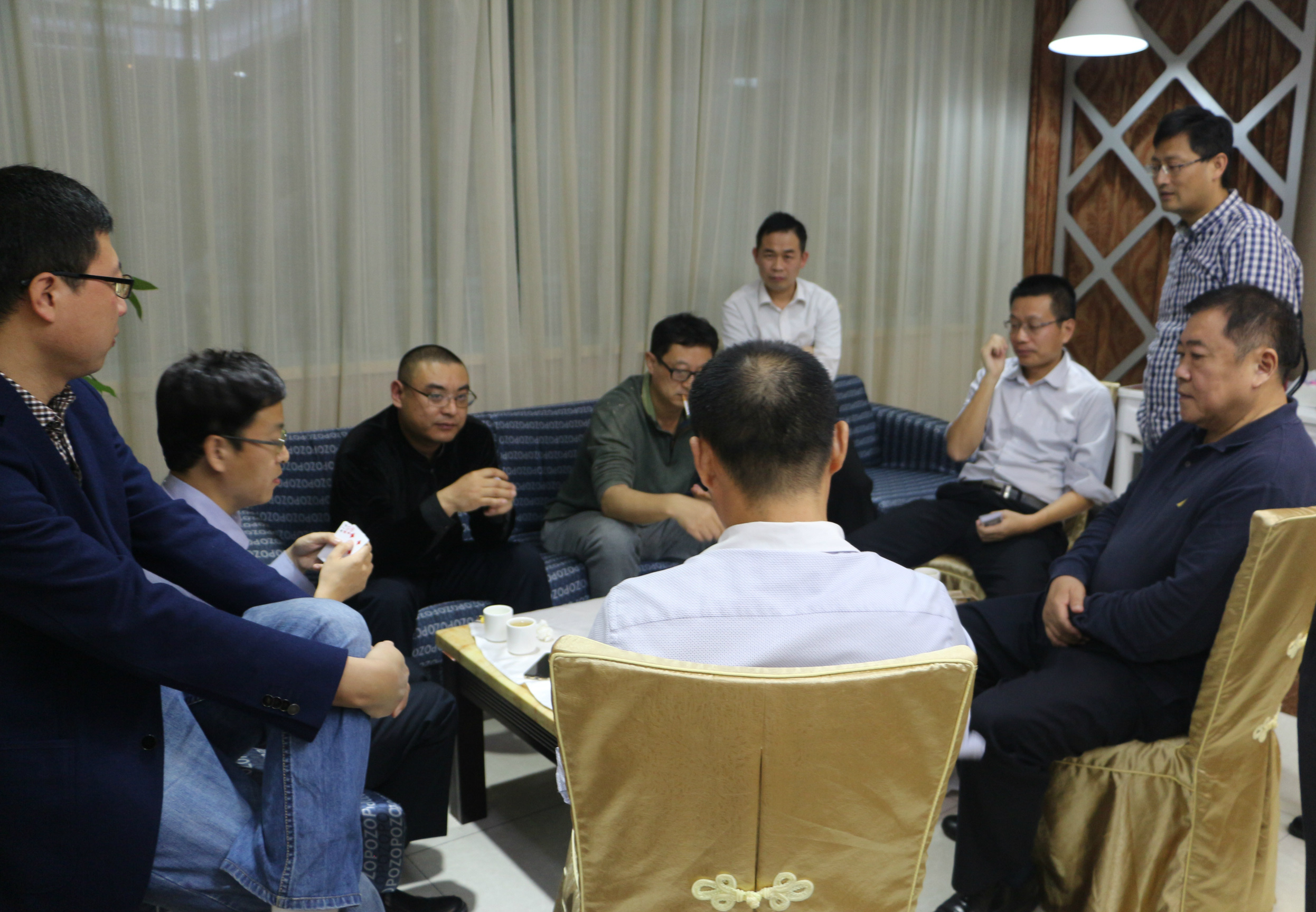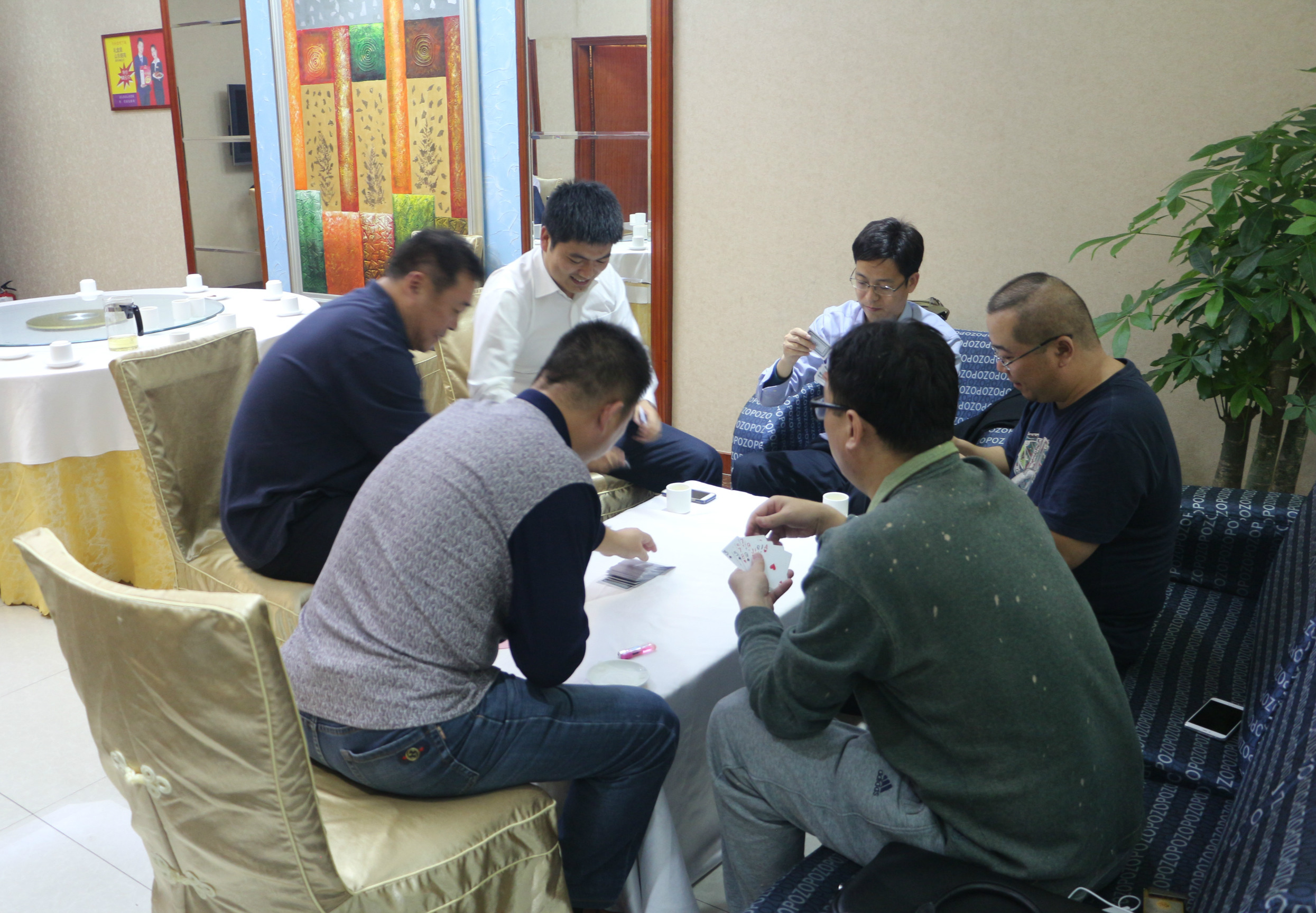 比賽結(jié)束后,常務(wù)副會長郭林槐,副會長楊利、張捷、賈朕分別為獲勝隊頒發(fā)團體獎杯和常務(wù)副會長郭林槐贊助的獎品,大家合影留念。之后在魯粵軒共進晚宴。席間,大家意猶未盡的交流牌技,相約下次再戰(zhàn)。