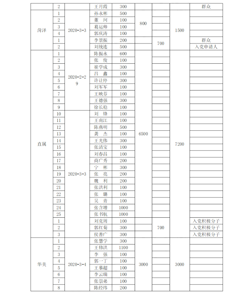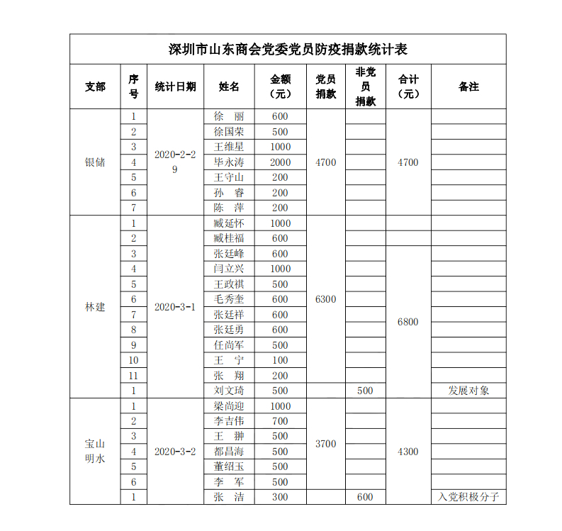 中共中央組織部發(fā)出號召后,習(xí)近平總書記為支持新冠肺炎疫情防控工作帶頭捐款。“疫情就是命令,防控就是責(zé)任”。深圳市山東商會黨委在深圳市社會組織黨委的部署安排下認(rèn)真做好了黨員自愿捐款的接收工作。黨員同志們自覺自愿、積極響應(yīng),在短短幾天內(nèi),108名黨員共捐款項(xiàng)35716元(另有8名非黨員也執(zhí)意捐款2500元)。3月6日,商會黨委已將黨員捐助的35716元款項(xiàng)如數(shù)上繳到市社會組織黨委(其他非黨員的捐款,商會黨委將根據(jù)疫情情況捐助到其他需要捐助的地方)。