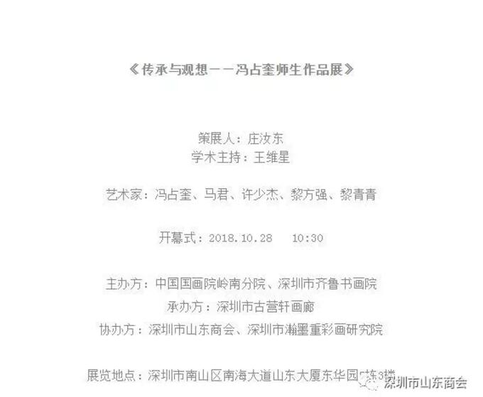 10月28日上午,“傳承與觀想——著名畫家馮占奎師生作品展”在深圳市南山區(qū)東華園5棟3樓隆重舉行開(kāi)幕儀式。此次畫展由中國(guó)國(guó)畫院嶺南分院、深圳市齊魯書(shū)畫院主辦,深圳市古營(yíng)軒畫廊承辦,深圳市山東商會(huì)、深圳市瀚墨重彩畫研究院協(xié)辦。深圳市各界嘉賓和書(shū)畫愛(ài)好者近100人出席了開(kāi)幕儀式。我會(huì)會(huì)長(zhǎng)王立新,創(chuàng)會(huì)會(huì)長(zhǎng)王維星,副會(huì)長(zhǎng)張捷,執(zhí)行秘書(shū)長(zhǎng)陳振永,副秘書(shū)長(zhǎng)張含增、王慶社等出席了開(kāi)幕式。