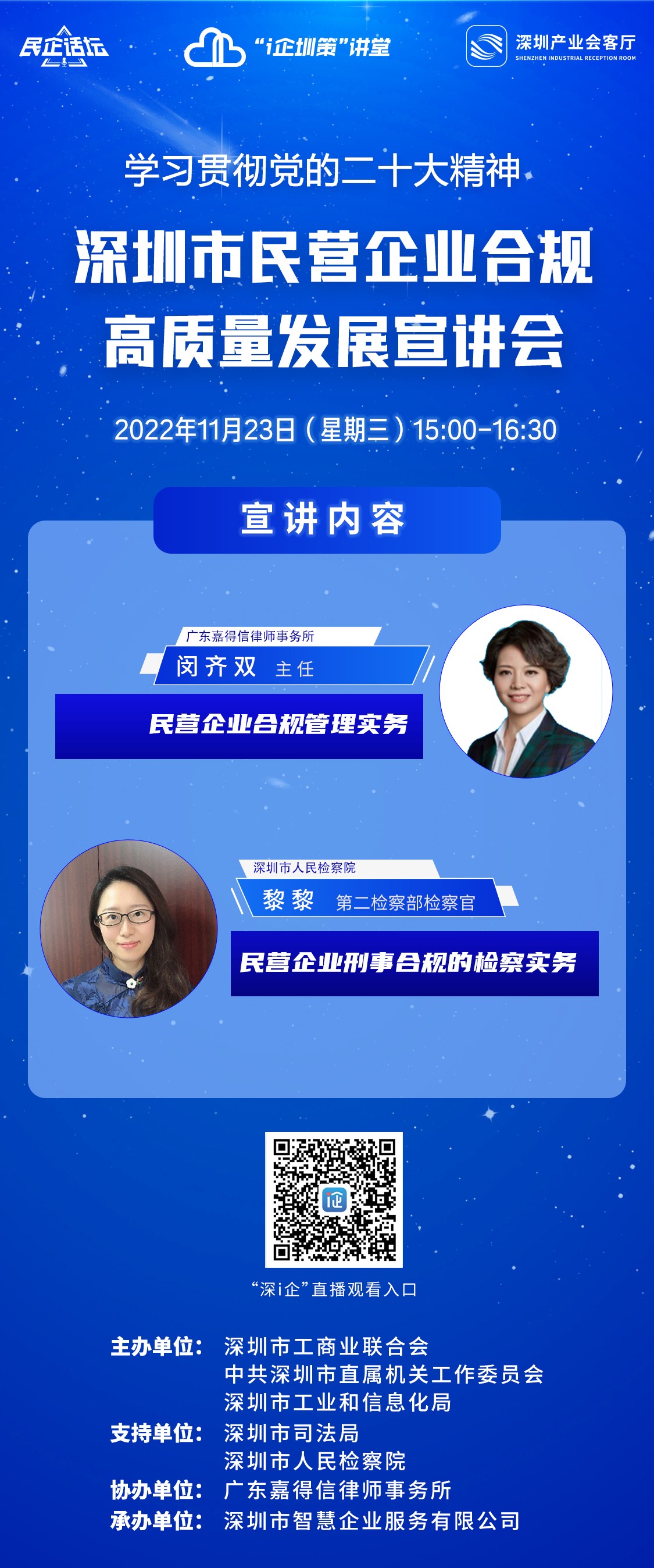 本場宣講會邀請來自深圳市人民檢察院、廣東嘉得信律師事務所合規(guī)領域?qū)<?,從實務出發(fā)詳細授課講解,指導民營企業(yè)合規(guī)管理建設?;顒右浴熬€上+線下”的形式舉行,“深i企”全程直播,現(xiàn)誠摯邀請企業(yè)家朋友們屆時掃描下方海報二維碼觀看。