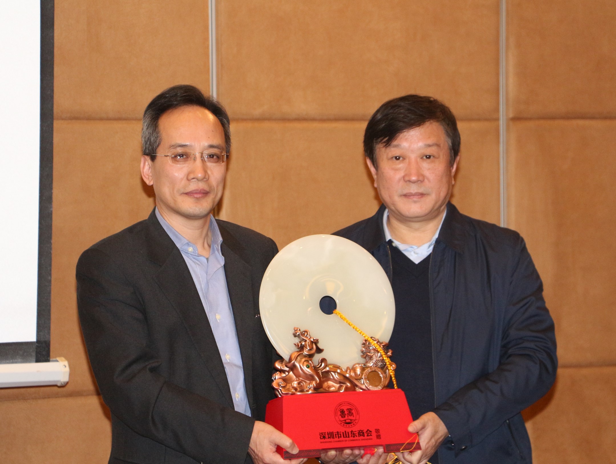 泰安市經(jīng)濟(jì)合作局王局長代表接收商會(huì)禮物“平安扣”