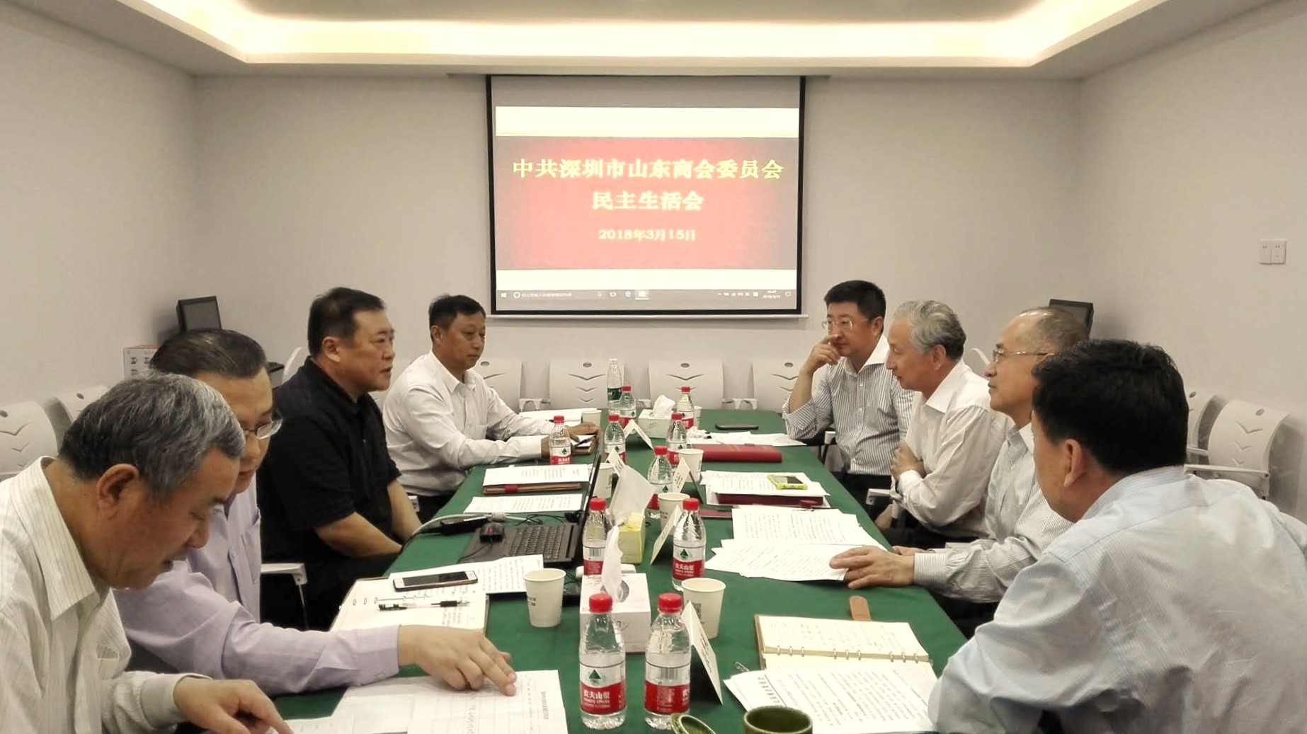 2018年3月15日下午,深圳市山東商會黨委全體成員在山東大廈四樓黨委會議室召開民主生活會。黨委書記王維星同志主持。黨委副書記王立新、張煥祥,黨委紀(jì)委書記張書航,黨委成員郭林槐、臧延懷等同志參會。