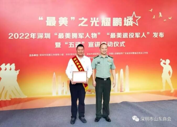 8月10日,“最美”之光耀鵬城,2022年深圳“最美擁軍人物”“最美退役軍人”發(fā)布暨“五進(jìn)”宣講啟動儀式在深圳特區(qū)報(bào)大廈會堂成功發(fā)布。深圳市山東商會執(zhí)行會長、深圳市人大代表、鑫輝餐飲集團(tuán)董事長王傳啟榮獲2022年“深圳最美擁軍人物”榮譽(yù)稱號!深圳市政府副市長陳清、深圳警備區(qū)副司令員喻曉等部門相關(guān)領(lǐng)導(dǎo)出席本次活動。