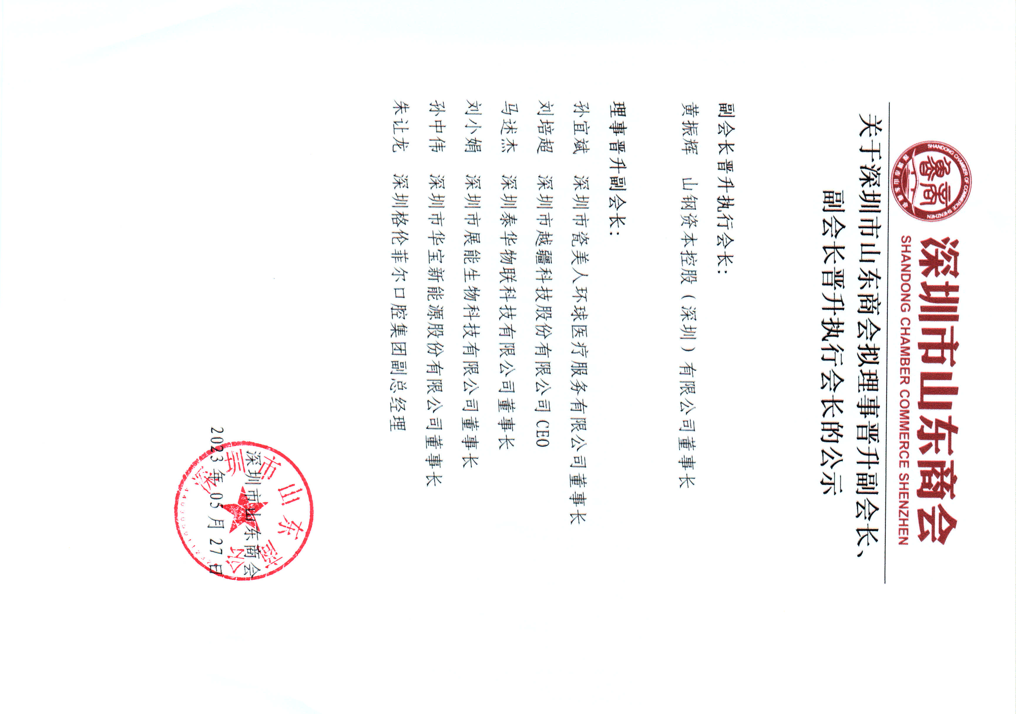 深圳市山東商會理事單位晉升副會長單位、理事單位晉升執(zhí)行會長單位公示