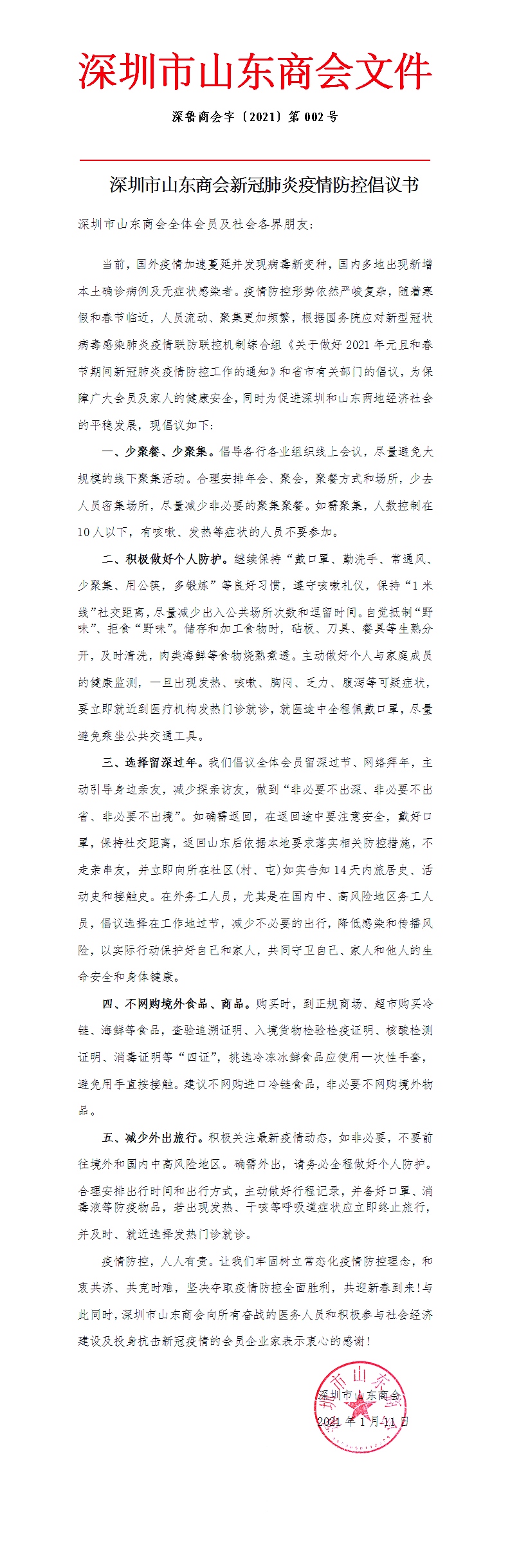 當(dāng)前,國(guó)外疫情加速蔓延并發(fā)現(xiàn)病毒新變種,國(guó)內(nèi)多地出現(xiàn)新增本土確診病例及無(wú)癥狀感染者。疫情防控形勢(shì)依然嚴(yán)峻復(fù)雜,隨著寒假和春節(jié)臨近,人員流動(dòng)、聚集更加頻繁,根據(jù)國(guó)務(wù)院應(yīng)對(duì)新型冠狀病毒感染肺炎疫情聯(lián)防聯(lián)控機(jī)制綜合組《關(guān)于做好2021年元且和春節(jié)期間新冠肺炎疫情防控工作的通知》和省市有關(guān)部門(mén)的倡議,為保障廣大會(huì)員及家人的健康安全,同時(shí)為促進(jìn)深圳和山東兩地經(jīng)濟(jì)社會(huì)的平穩(wěn)發(fā)展,現(xiàn)倡議如下: