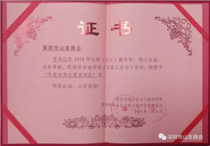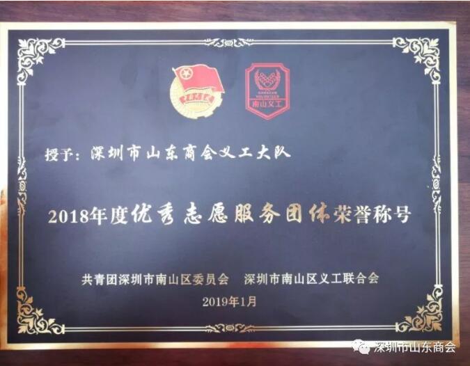 深圳市山東商會(huì)義工大隊(duì)榮獲“2018年度優(yōu)秀志愿服務(wù)團(tuán)體”榮譽(yù)稱號(hào)