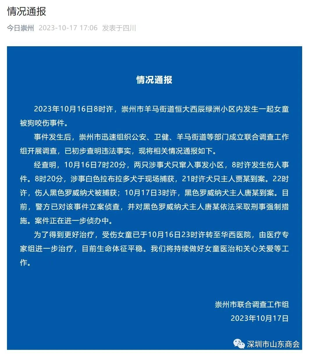 10月18日,記者向四川省公安廳核實(shí)了解到,10月16日咬傷女童的黑色羅威納犬只主人唐某已被崇州警方依法刑事拘留。