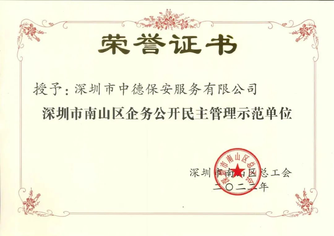 近日,從南山區(qū)總工會傳來好消息,中德保安公司榮獲2022年度“企務(wù)公開民主管理示范單位”,這也是新春佳節(jié)后獲得的第一個榮譽,欣喜之余倍受鼓舞。