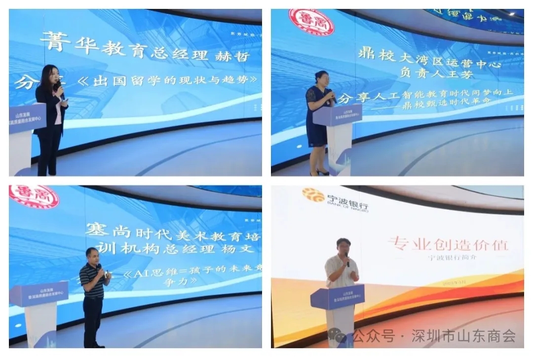 隨后,理事單位樂思學菁華教育咨詢(深圳)有限公司總經(jīng)理赫哲以《出國留學的現(xiàn)狀與趨勢》為題作了出國留學相關主題分享;理事單位鼎校大灣區(qū)運營中心負責人王芳以《人工智能教育時代同夢向上》為題分享了科學賦能孩子學習,智能陪伴孩子輕松提分;會員單位塞尚思維培訓中心總經(jīng)理楊文以《塞尚美術關注孩子的思維成長》為題分享了因材施教、科學培育、思維繪畫的相關知識;寧波銀行深圳分行負責人分享了“寧寶貝”服務相關金融知識。專家們通過案例分析、政策解讀等形式,深入剖析文化教育產(chǎn)業(yè)的前沿趨勢,培訓內(nèi)容兼具理論深度與實踐指導性,為企業(yè)家今后的孩子教育實踐提供了新思路。