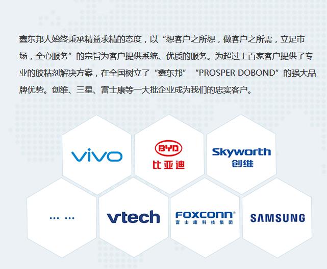 公司可根據(jù)客戶需求量身定做產(chǎn)品,幫客戶解決新產(chǎn)品開發(fā)過程的各種粘接難題,為客戶提供專業(yè)的技術(shù)服務(wù)。鑫東邦人始終秉承精益求精的態(tài)度,以"想客戶之所想,做客戶之所需,立足市場(chǎng),全心服務(wù)”的宗旨為客戶提供系統(tǒng)、優(yōu)質(zhì)的服務(wù)。為超過上百家客戶提供了專業(yè)的膠粘劑解決方案,在全國(guó)樹立了“鑫東邦”“PROSPERDOBOND”的強(qiáng)大品牌優(yōu)勢(shì)。