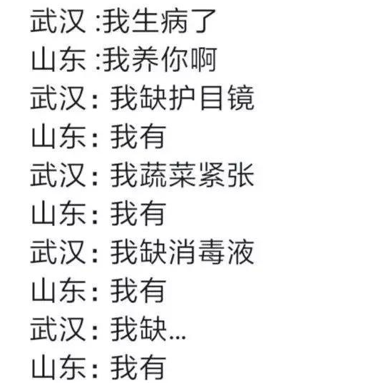 武漢當(dāng)時(shí)缺護(hù)目鏡,青島連夜送去2萬(wàn)副。湖北口罩緊缺,山東每天送去超過(guò)100萬(wàn)個(gè)。還有建材、機(jī)械設(shè)備、醫(yī)用酒精、消毒液……山東幾乎是“缺啥有啥,有啥給啥”。然后網(wǎng)友就創(chuàng)造了個(gè)新詞:搬家式救援。