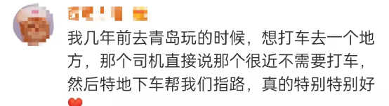 還有位網(wǎng)友說(shuō),幾年前去青島玩時(shí),想打車去一個(gè)地方。結(jié)果,司機(jī)直接說(shuō)那地方很近,壓根就不需要打車。還特地下車,幫著指路。