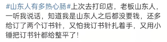 有位網(wǎng)友說(shuō),有一次去打印店,老板是山東人。一聽(tīng)他說(shuō)話的口音,知道是山東老鄉(xiāng),不僅沒(méi)要錢(qián),還多給訂了兩個(gè)訂書(shū)針。