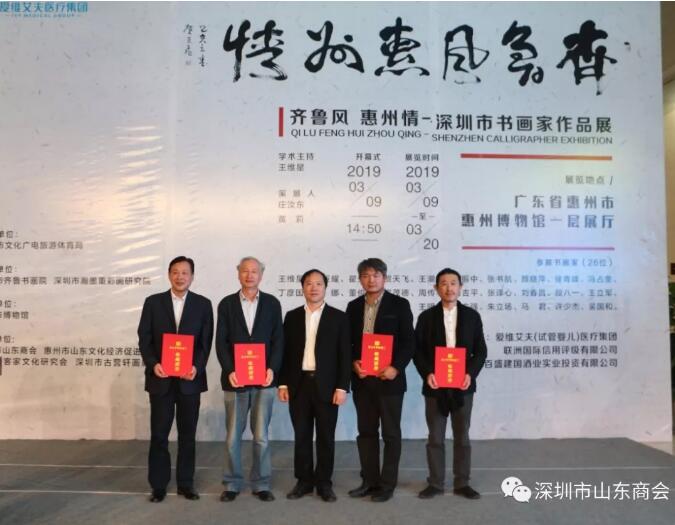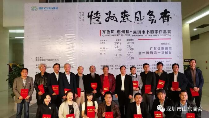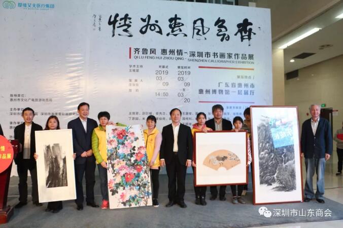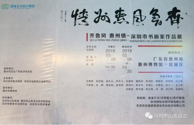 春雨紛沓至,共賀齊魯風(fēng)。2019年3月9日,齊魯風(fēng)·惠州情——深圳市書畫家作品展在廣東惠州博物館隆重開幕。此次畫展由惠州市文化廣電旅游體育局指導(dǎo),深圳市齊魯書畫院、深圳市翰墨重彩畫研究院主辦,惠州市博物館承辦,深圳市山東商會、惠州市山東文化經(jīng)濟(jì)促進(jìn)會、深圳市客家文化研究會、深圳市古營軒畫廊等單位協(xié)辦,并得到我會常務(wù)副會長單位愛維艾夫(試管嬰兒)醫(yī)療集團(tuán)冠名贊助及聯(lián)洲國際信用評級有限公司、東莞市百盛建國酒業(yè)實業(yè)投資有限公司等單位的大力贊助支持。