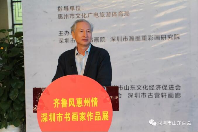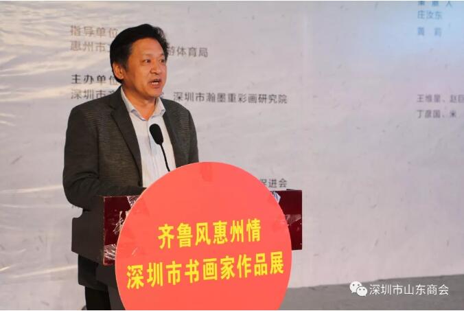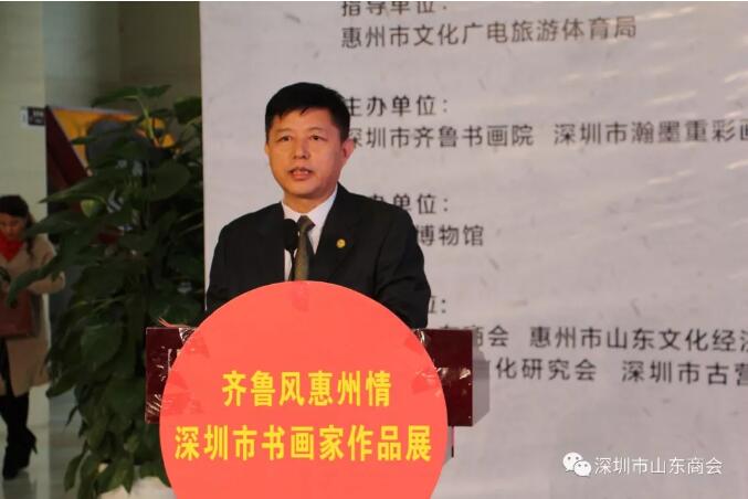 惠州市山東文化經(jīng)濟(jì)促進(jìn)會會長梁衍強(qiáng)在致辭中表示∶ 深圳市山東商會與惠州市山東文化經(jīng)濟(jì)促進(jìn)會近年來聯(lián)系緊密,互相學(xué)習(xí),相互合作,共同發(fā)展。借這次畫展開幕,我們兩家會員又進(jìn)一步面對面交流,加強(qiáng)了了解,增進(jìn)了友誼,歡迎深圳的企業(yè)家們來惠州發(fā)展。并祝賀本次書畫展取得圓滿成功。