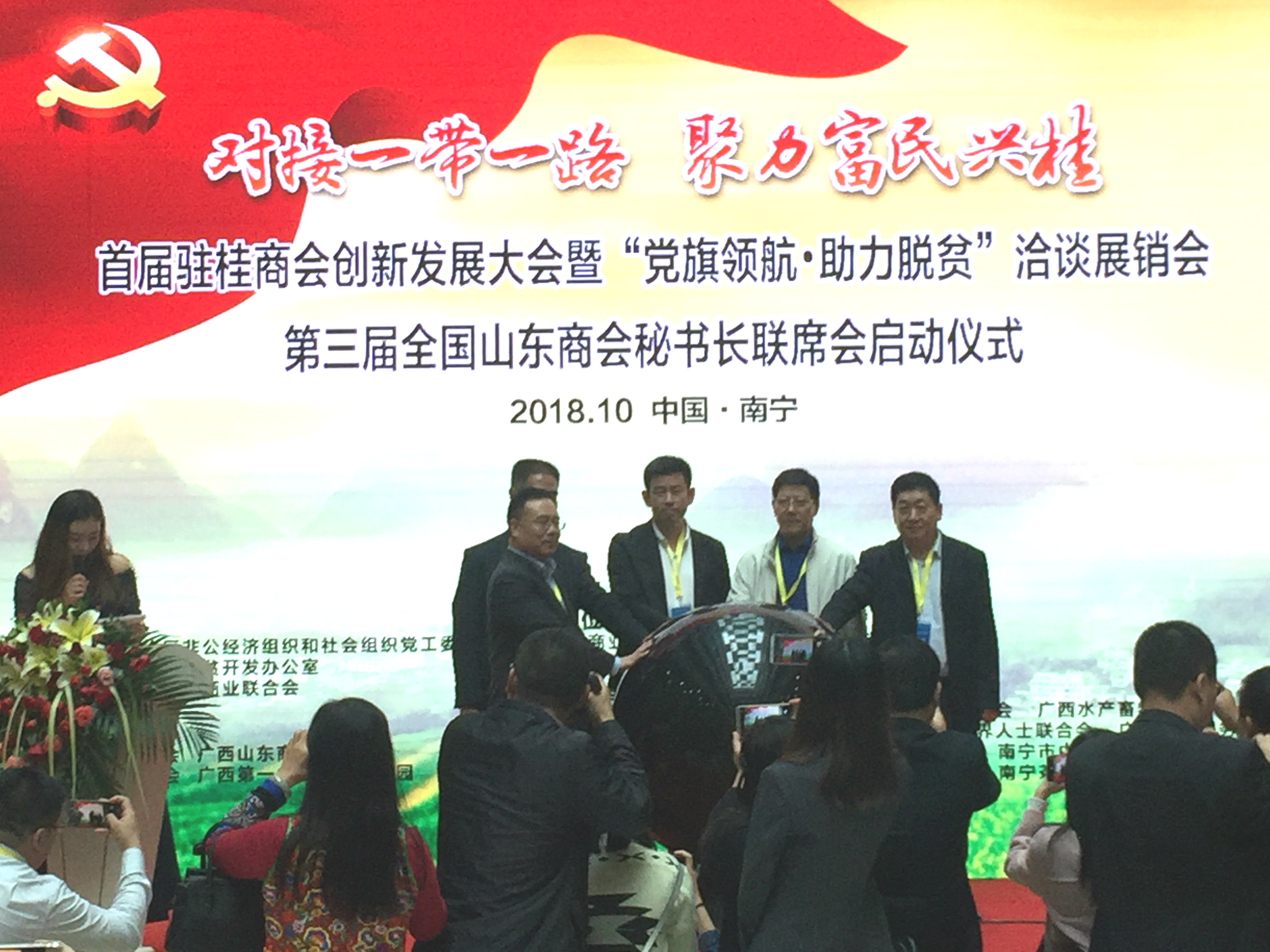 會議期間,全國省級山東商會秘書長在南寧華南城與5家東盟國家的領(lǐng)事進行了座談,并參加了以“對接一帶一路 聚力富民興桂”為主題的“首屆駐桂商會創(chuàng)新發(fā)展大會暨‘黨旗領(lǐng)航·助力脫貧’洽談?wù)逛N會開幕式”。開幕式上,廣西山東商會秘書長邢全祥,山東省魯商聯(lián)盟秘書長徐繼響,四川省山東商會秘書長楊濤,山東省齊魯文化促進會秘書長崔東方、中國齊魯文化促進會副秘書長楊永起共同為第三屆全國山東商會秘書長聯(lián)席會正式啟動。并發(fā)表了成立“魯商(東盟)信息交流中心”和“魯商(廣西)康養(yǎng)基地”兩大平臺的倡議。
