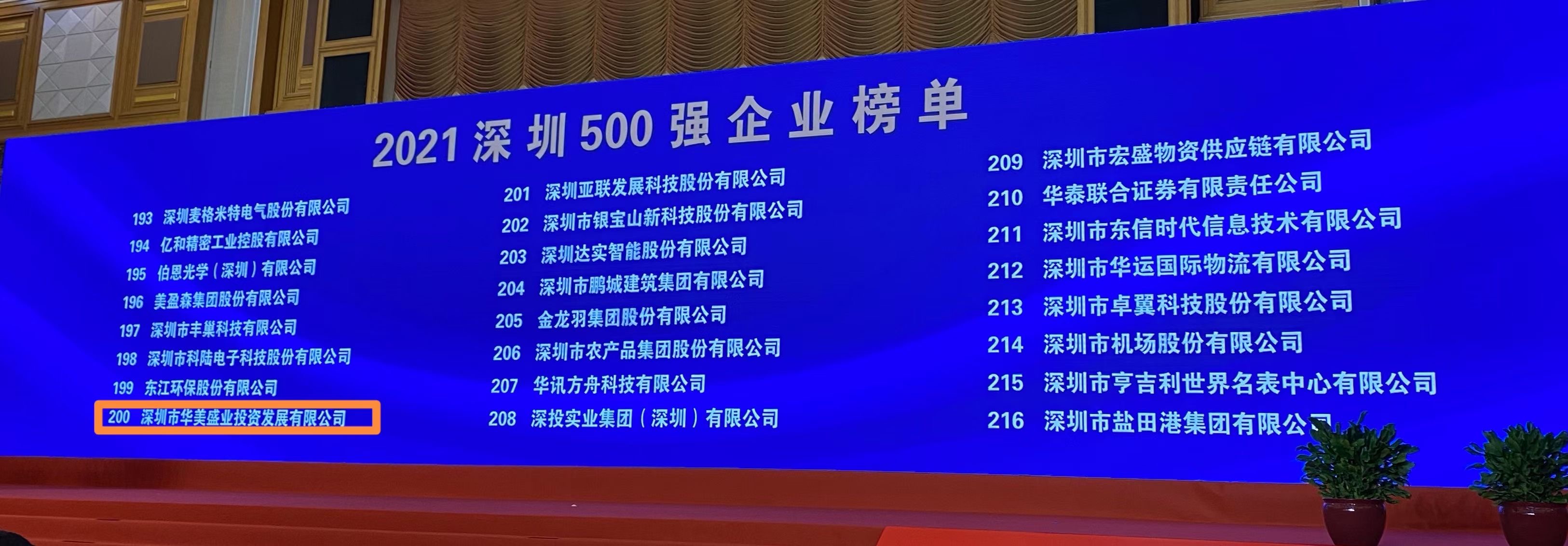 熱烈祝賀深圳市山東商會黨委副書記、執(zhí)行會長、深圳市華美盛業(yè)投資發(fā)展有限公司董事長張煥祥獲得“深圳百名行業(yè)領(lǐng)軍人物”榮譽稱號,公司在2021年“深圳500強企業(yè)”排名晉升至200名。