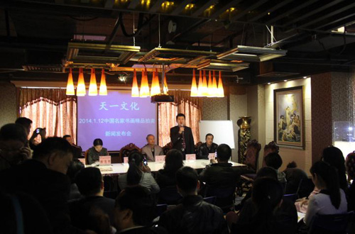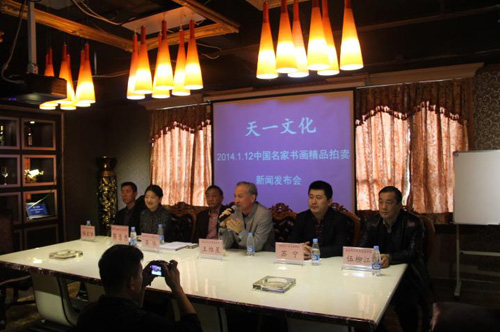 2014年1月6日下午,由深圳市山東商會、深圳市天一文化發(fā)展有限公司、深圳施惠藝術(shù)品投資有限公司、深圳文物藝術(shù)品收藏協(xié)會聯(lián)合主辦的“盛世典藏,藝暉鵬城——天一文化中國名家書畫精品大型拍賣會”新聞發(fā)布會,在深圳羅湖區(qū)紅桂路紅桂大酒店山東商會會館舉行。王維星會長、伍柳江秘書長和商會理事、秘書長助理、深圳市天一文化發(fā)展有限公司董事長蘇寧及深圳文物藝術(shù)品收藏協(xié)會會長龔偉、深圳市山西商會副秘書長任宏華等約30多位新聞媒體嘉賓出席。