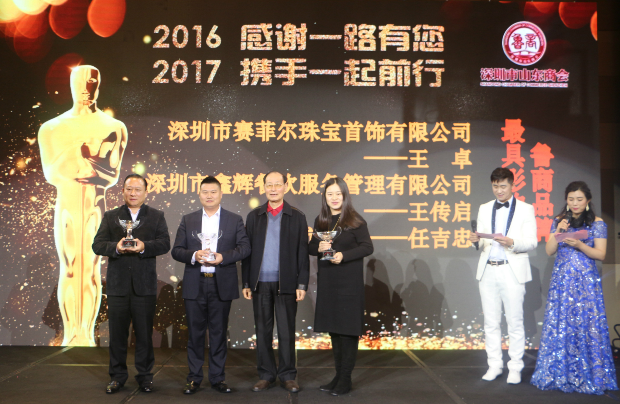 商會(huì)自成立以來,涌現(xiàn)出一批優(yōu)秀的企業(yè)和會(huì)員。商會(huì)為評(píng)先進(jìn),樹優(yōu)秀,立榜樣,在2016年度“評(píng)先樹優(yōu)”頒獎(jiǎng)典禮環(huán)節(jié)中,原深圳市副市長(zhǎng)、深圳市人大副主任郭榮俊先生為獲得“2016年度魯商品牌最具影響力獎(jiǎng)”的深圳市賽菲爾珠寶首飾有限公司、深圳市鑫輝餐飲服務(wù)管理有限公司、愛維艾夫醫(yī)療集團(tuán)頒發(fā)了獎(jiǎng)杯。