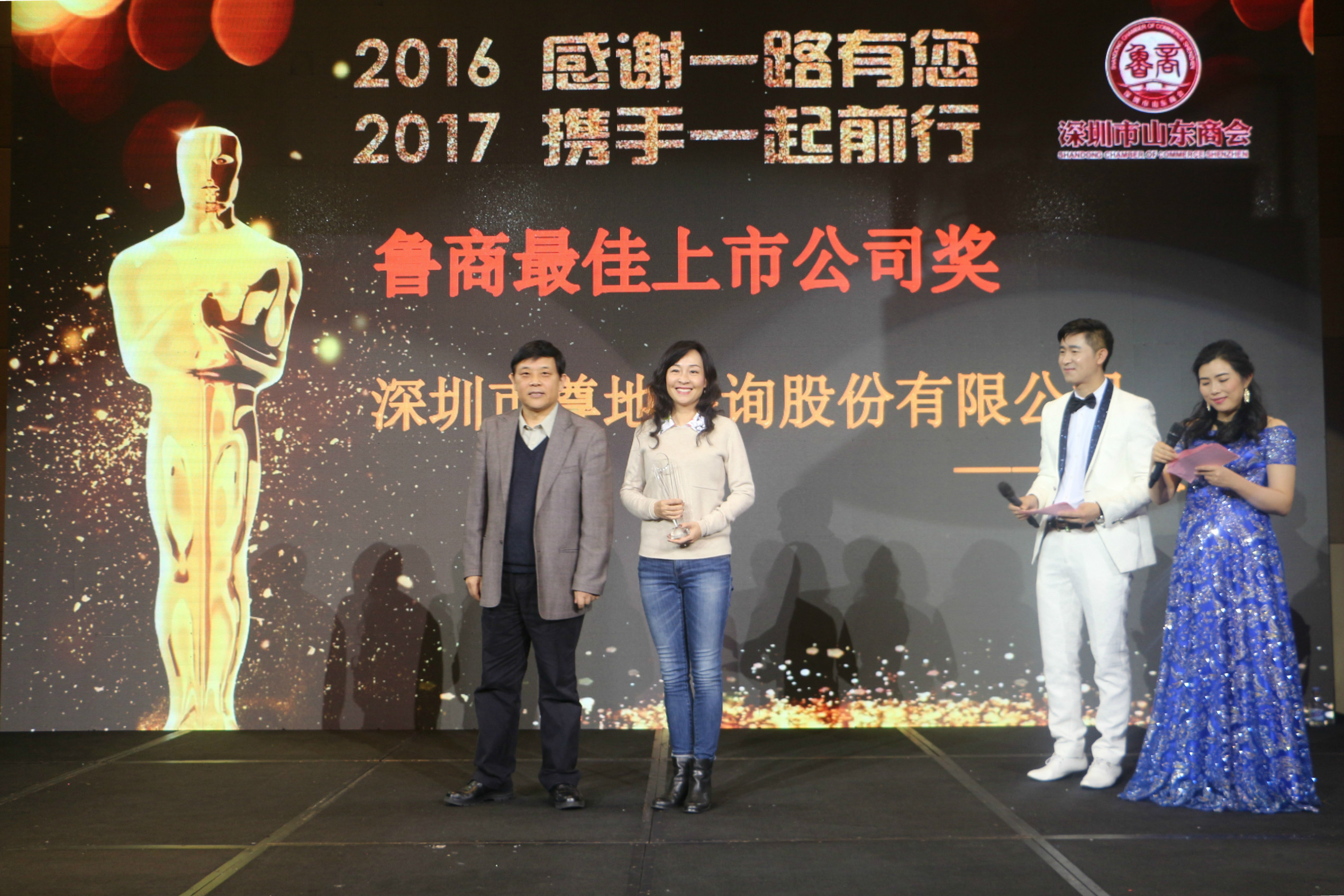 山東省人民政府駐深圳辦事處主任劉恒昌先生為“2016年度魯商最佳上市公司獎(jiǎng)”獲得者深圳市尊地咨詢股份有限公司頒發(fā)了獎(jiǎng)杯。