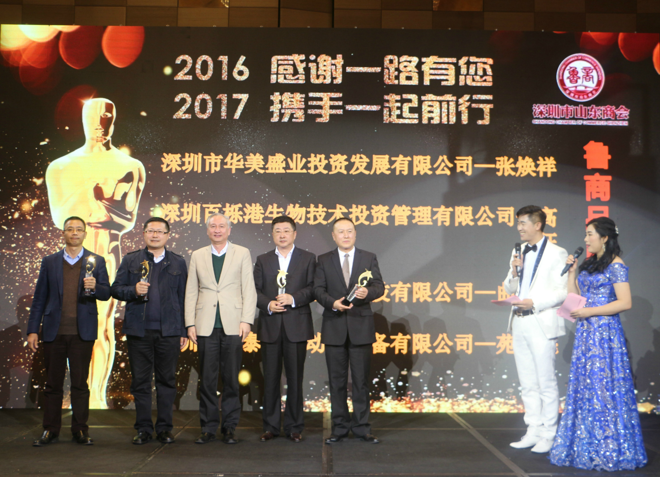 深圳市山東商會(huì)創(chuàng)會(huì)會(huì)長(zhǎng)王維星先生為“2016年度魯商品牌創(chuàng)新獎(jiǎng)”獲得者深圳市華美盛業(yè)投資發(fā)展有限公司、深圳百櫟港生物技術(shù)投資管理有限公司、深圳市兆通影視科技有限公司、深圳市飛泰科自動(dòng)化裝備有限公司頒發(fā)獎(jiǎng)杯。