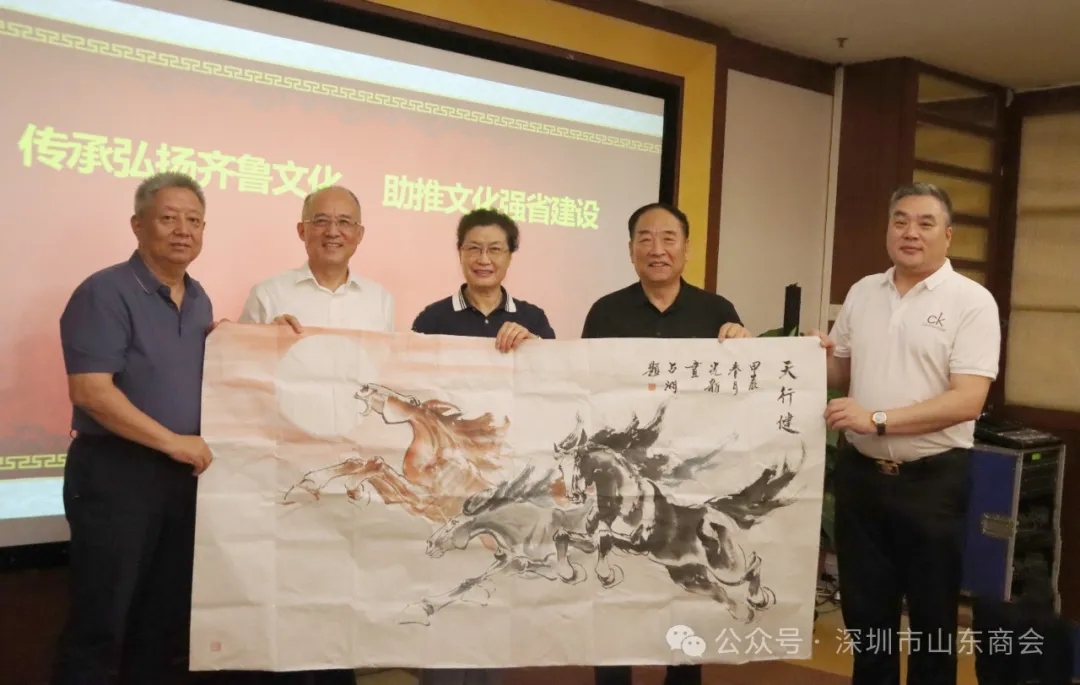 吳翠云主席在講話中說,此次文促會在深考察活動得到了深圳市山東商會的大力支持,體現(xiàn)了商會對于我省文化事業(yè)的高度重視,并對山東商會的熱情接待和周到安排表示衷心感謝,對商會近年來的工作和取得的成績表示由衷敬佩。吳翠云主席表示,深圳市山東商會作為全國四好商會和在深魯商展示平臺,為齊魯傳統(tǒng)文化傳承推廣、企業(yè)文化建設(shè),提供了大量不可或缺的經(jīng)驗,充分發(fā)揮了“排頭兵”作用,很受振奮、很受鼓舞。她指出,中華優(yōu)秀傳統(tǒng)文化是中華文明的智慧結(jié)晶和精華所在,是中華民族的根和魂,是我們在世界文化激蕩中站穩(wěn)腳跟的根基。作為中華文明的重要發(fā)祥地之一,山東歷史文化底蘊深厚,革命文化波瀾壯闊,民俗文化豐富多彩,社會主義先進文化精彩紛呈,齊魯文脈的賡續(xù)與中華文脈的形成發(fā)展始終緊密相連、同向前行。5月22日—24日,習(xí)近平總書記在山東考察期間強調(diào),山東要擔(dān)負起新時代的文化使命,在推動文化繁榮、建設(shè)文化強國、建設(shè)中華民族現(xiàn)代文明上積極作為。習(xí)近平總書記的重要指示為我們做好齊魯文化傳承發(fā)展工作指明了方向,提供了根本遵循和強大動力,也為齊魯文化發(fā)展帶來了新的機遇、注入了新的活力,在文化傳承發(fā)展的道路上,山東責(zé)無旁貸,使命光榮,責(zé)任重大。吳翠云表示,未來山東省齊魯文化促進會將與深圳市山東商會加強合作,親密合作伙伴關(guān)系,攜手傳承齊魯精神,弘揚齊魯文化,謀求更多維度合作,實現(xiàn)相互賦能,同心助力文化強省目標(biāo)實現(xiàn)。