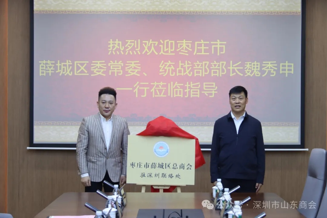 會上,雙方就如何加強信息溝通、搭建合作平臺、推進項目落地等方面達成了共識。隨后魏秀申部長和孫宜斌副會長為“薛城區(qū)總商會駐深圳聯(lián)絡(luò)處”揭牌。魏秀申部長表示,駐深聯(lián)絡(luò)處揭牌儀式只是開始,希望通過揭牌薛城區(qū)能與深圳建立友好往來,能與深圳企業(yè)家結(jié)下深厚友誼,共同推動兩地合作結(jié)出豐碩成果。