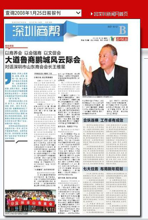 深圳市山東商會(huì)成立時(shí)間雖然只有一年半,但工作開(kāi)展得有聲有色。在新年來(lái)臨之際,深圳晚報(bào)《深圳商幫》“會(huì)長(zhǎng)訪談”欄目專訪了會(huì)長(zhǎng)王維星。