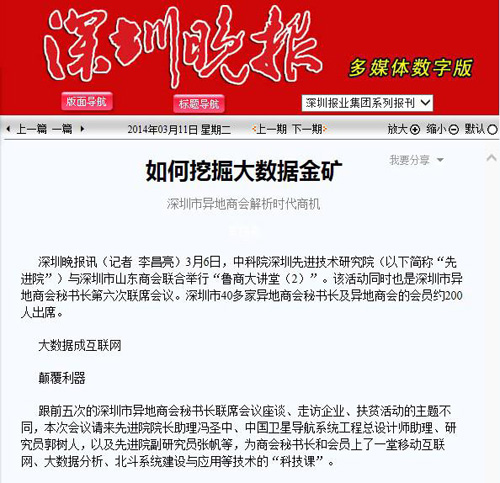 2014年3月11日深圳晚報(bào)B15版《深圳商幫》刊登《如何挖掘大數(shù)據(jù)金礦--深圳市異地商會(huì)解析時(shí)代商機(jī)》再次對(duì)由我會(huì)承辦的深圳市異地商會(huì)秘書長(zhǎng)第六次聯(lián)席會(huì)議暨《魯商大講堂(2)》進(jìn)行報(bào)道。