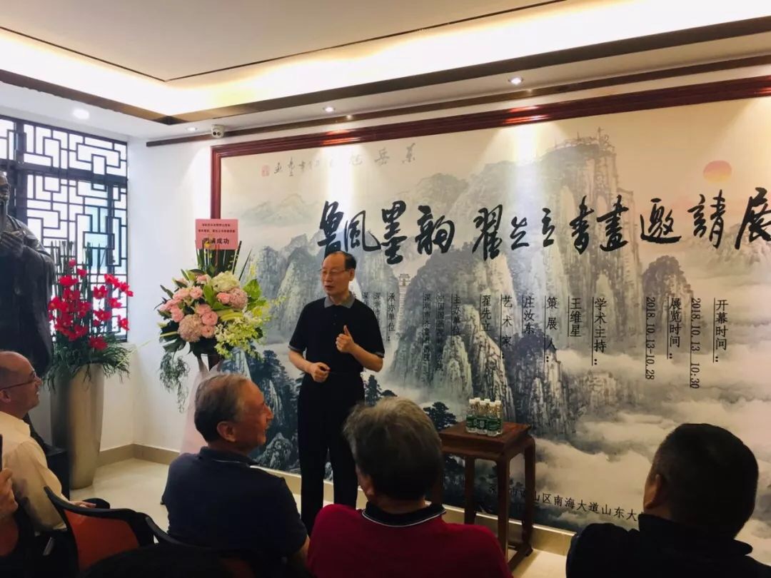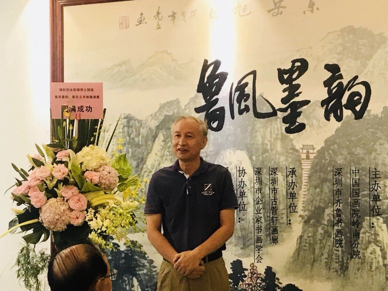 王立新會長在致辭中首先代表深圳市山東商會對翟老書畫展的舉辦表示衷心的祝賀?!皬恼?jīng)商、一身正氣、無欲則剛;繪畫書法、立意高遠、張弛有度“是王會長對翟老事業(yè)藝術(shù)的評價。王會長表示,各類書畫展的舉辦給深圳市山東商會帶來了豐富的藝術(shù)氣息,為商會文化體系的完善做出了卓越貢獻。最后,王會長代表深圳市山東商會和廣大山東籍會員對中國國畫院嶺南分院、深圳市齊魯書畫院搭建的藝術(shù)交流平臺表示衷心的感謝。
