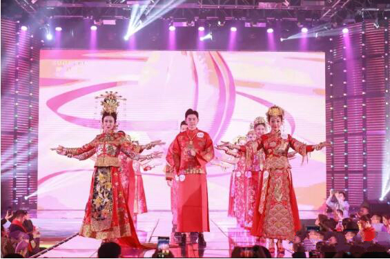 盛典上,一場(chǎng)10分鐘的萬(wàn)足金婚紗秀令人驚艷贊嘆,賽菲爾珠寶歷年共計(jì)18套萬(wàn)足金婚紗齊亮相。伴隨著悅動(dòng)的音符,18位男女模特身披華彩熠熠的絕美婚紗及男士唐裝結(jié)婚禮服,在如夢(mèng)似幻的燈光中緩緩入場(chǎng),將全場(chǎng)氣氛點(diǎn)燃。